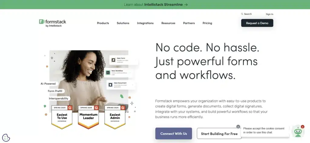 Formstack offers secure forms, document generation, and no-code workflows. It’s widely used in healthcare, financial services, government, and education for compliant data capture with e-sign and approvals.